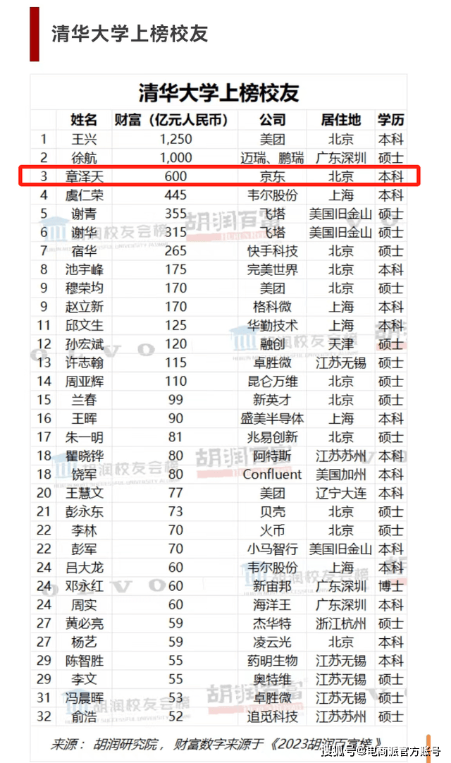 2024年,胡润研究院发布《胡润校友会榜》,在校友会榜中,在清华大学上榜校友的名单中,章泽天在列,以净资产600亿的身家在清华优秀校友中排行第三。