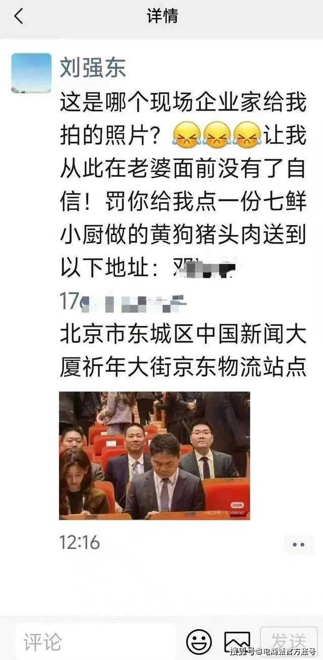 随即,刘强东在朋友圈发文调侃:“这是哪个现场企业家给我拍的照片?让我从此在老婆面前没有了自信!罚你给我点一份七鲜小厨做的黄狗猪头肉。”马上,关于#刘强东从此在老婆面前没有了自信# 的话题冲上微博热搜。