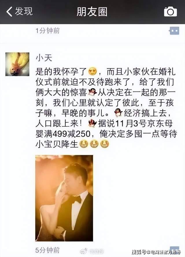 2015年章泽天在朋友圈官宣怀孕时,顺手就给京东打了个广告:“经济搞上去,人口跟上来!据说11月3日京东母婴满499减250,俺决定多囤一点等待小宝贝诞生。”