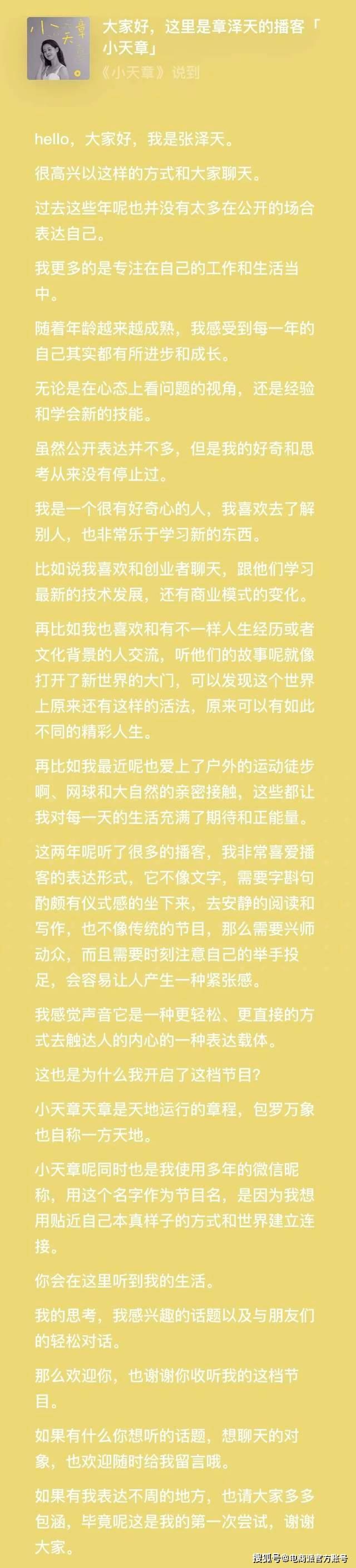 新年伊始,奶茶妹妹章泽天亲自下场做播客,开小红书账号运营。近日其在播客平台小宇宙平台开通个人账号,并取名“小天章”,首期节目是时长不到3分钟的自我介绍,节目播出1小时,收听量已破万。