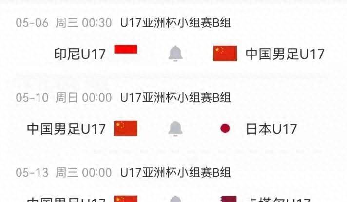 亚足联在2月15日公布了2026年U17亚洲杯的具体赛程。 中国队所在的B组三场比赛全在凌晨进行,首战印尼安排在5月6日00:,次轮对阵日本是5月10日00:00,末轮迎战卡塔尔则是5月13日00:00。 这样的时间安排意味着国内球迷需要熬夜观赛,但比起熬夜,更重要的是这几场比赛的时间线直接决定了中国队的出线命运。