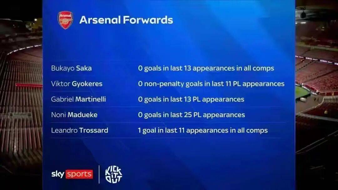两次舞台,一种悲伤,难怪球迷调侃:“萨卡像一把瑞士军刀,但阿森纳还是缺了把尖刀。”新赛季的萨卡在临门一脚上并没有脱胎换骨。据统计,他本赛季的英超射门转化率只有13%,14场进球荒放大了关于领袖的质疑声,并且媒体挖出了“客场虫”的黑历史,自2024年4月客场对阵布莱顿以来,阿森纳的7号一度在长达19个月时间内未能在伦敦以外的英超赛场取得进球。
