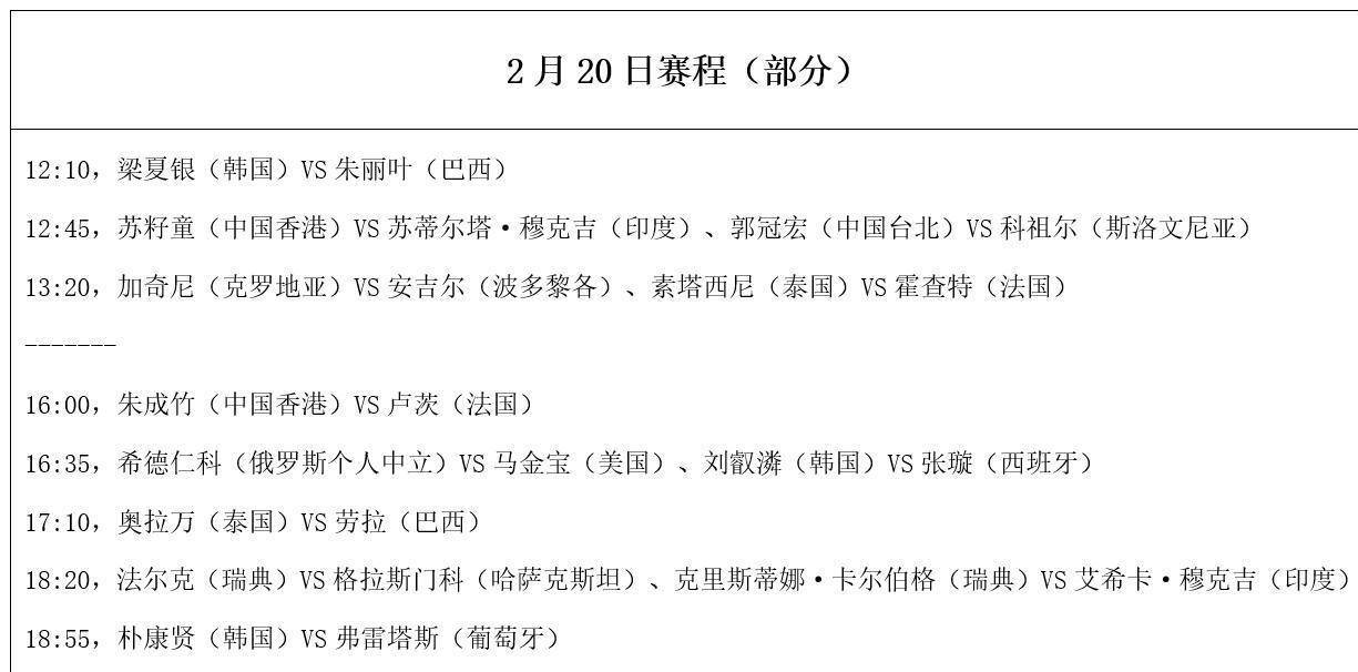 下午4点,中国香港的朱成竹将对阵法国的卡米尔·卢茨。 朱成竹昨天刚3比0横扫了对手,状态正热。 到了傍晚6点20分,有一场焦点战绝对不能错过:瑞典的世界冠军法尔克,要对上昨天刚爆冷淘汰了名将的哈萨克斯坦黑马格拉斯门科。 法尔克自己最近状态也不理想,而格拉斯门科正是手最热的时候,这场球,世界冠军想过关,恐怕得脱层皮。