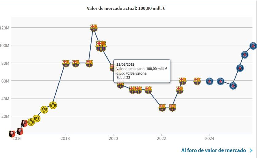 登贝莱出道时备受瞩目,但在巴塞罗那的职业生涯却一直未达到预期,伤病也不时困扰他,使他长期被视为“玻璃人”。他的身价区间曾从最高约1.2亿欧元,最低也有过大约3000万欧元的波动。