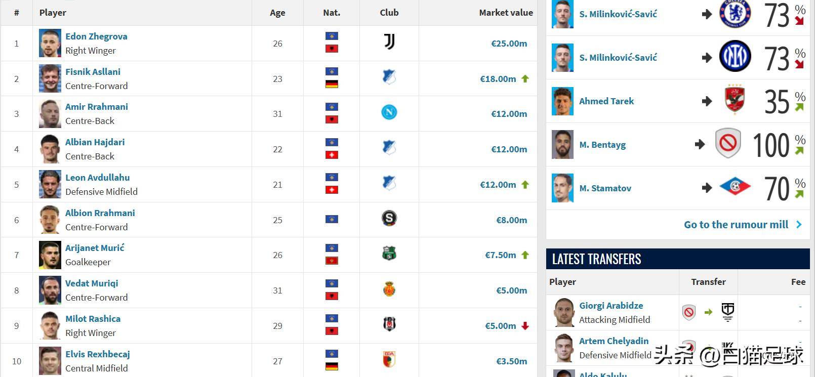 根据转会市场网站的数据,科索沃目前身价最高的五位球员都效力于五大联赛,其中尤文图斯和那不勒斯的球员各占两位,霍芬海姆的球员有三位。科索沃的明星球员泽格罗瓦,曾在法甲里尔效力,现在效力于尤文图斯,身价已达到2500万欧元。而霍芬海姆的中锋阿斯拉尼,凭借着在客场对瑞典的关键进球,身价已经飙升至1800万欧元。除此之外,海达里和阿夫杜拉胡等霍芬海姆球员,以及意甲那不勒斯的后卫拉赫马尼,身价也都达到了1200万欧元。