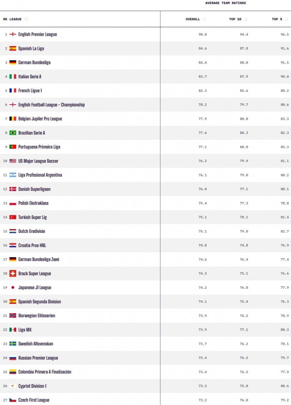 值得注意的是,英格兰第2级别联赛“英冠”竟然高居第6位,超越了其他传统足球强国的一级联赛,如比甲、巴甲和葡超。而梅西所效力的美职联则排名第10位。