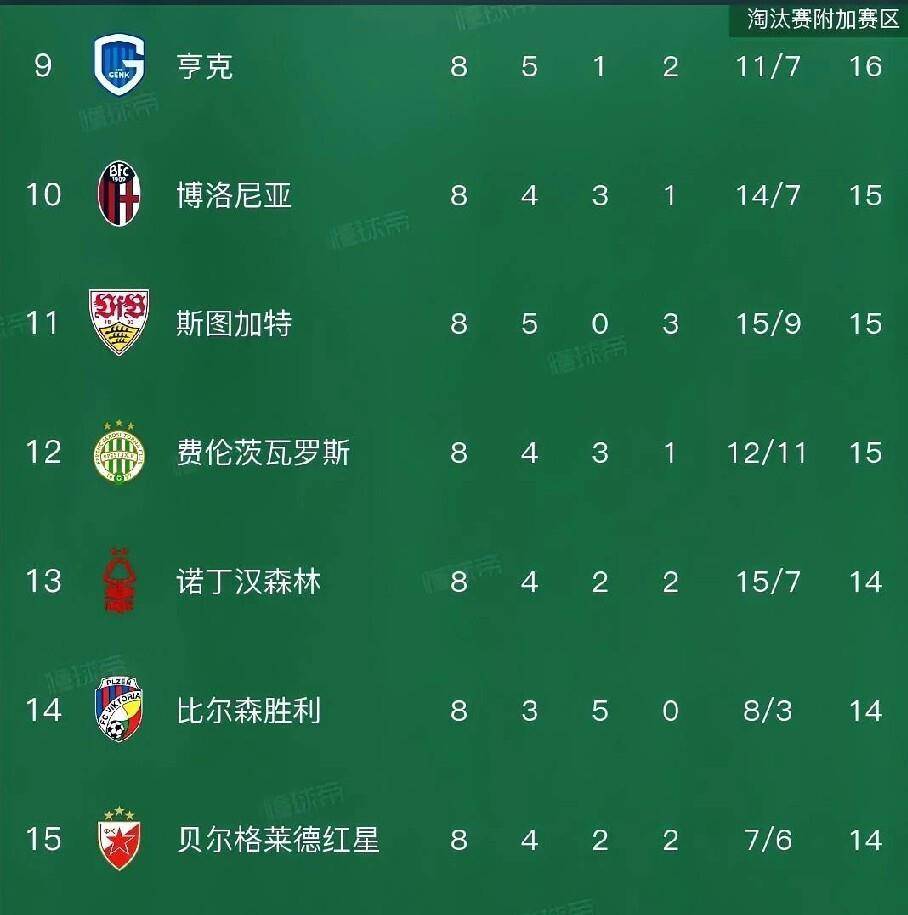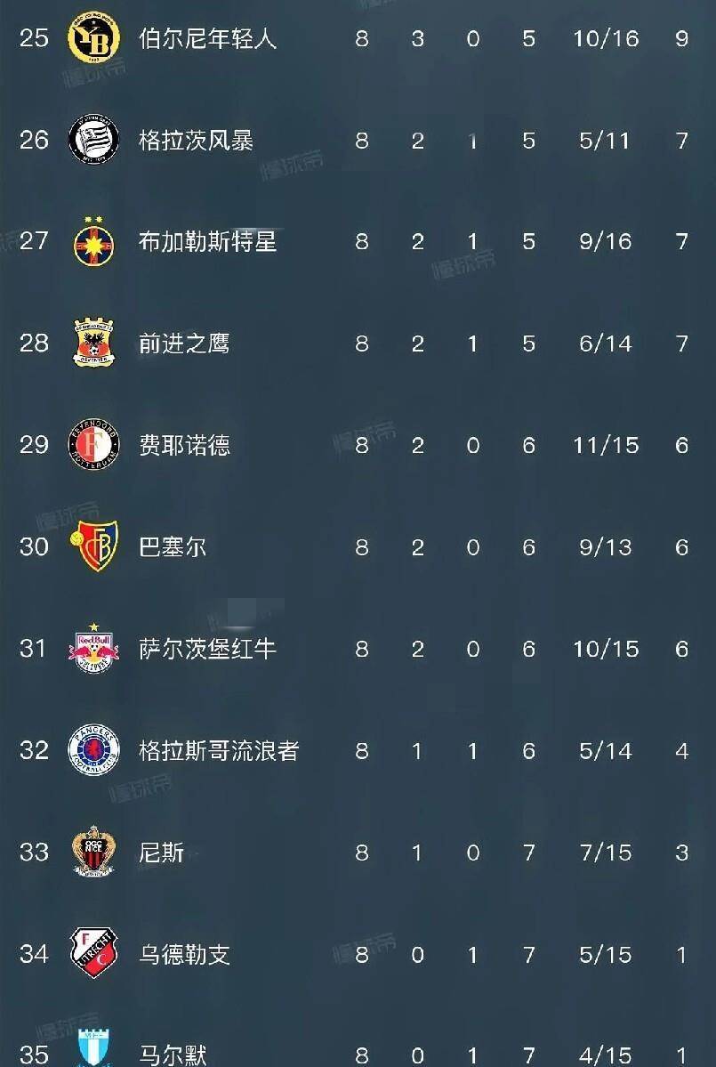 与此同时,被淘汰出局的球队共有12支,他们的排名从第25位到第36位。在这份名单中,不乏一些令人熟悉的名字。荷甲劲旅费耶诺德仅积6分,早早出局。奥地利豪门萨尔茨堡红牛同样只有6分,他们在最后一轮被阿斯顿维拉逆转,遗憾告别。苏超的格拉斯哥流浪者更是只拿到4分,战绩惨淡。而最失意的五大联赛球队当属法甲的尼斯,他们8场比赛1胜7负,仅积3分,在36支球队中排名第33位,早早确定了出局的命运。