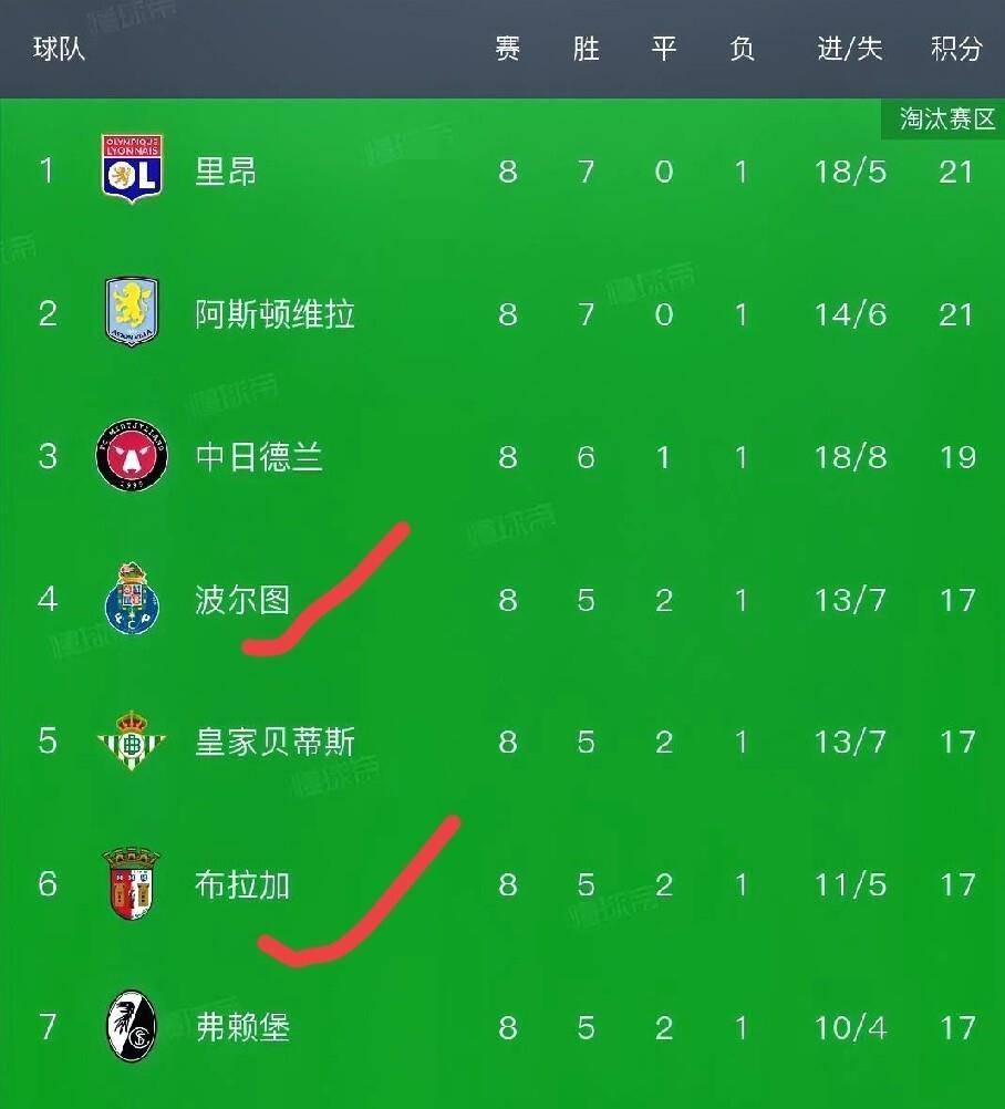 从最终的联赛阶段积分榜来看,里昂与阿斯顿维拉同积21分,但里昂凭借13个净胜球的优势,力压维拉排名第一。中日德兰以19分位列第三。从第四名皇家贝蒂斯到第七名弗赖堡,四支球队同积17分,竞争之激烈可见一斑。而积16分的罗马则幸运地压线晋级。在直接晋级的八支球队中,五大联赛各占一席之地:里昂(法甲)、阿斯顿维拉(英超)、皇家贝蒂斯(西甲)、弗赖堡(德甲)、罗马(意甲)。然而,最令人瞩目的亮点却来自葡超,他们有两支球队——波尔图和布拉加——成功跻身前八。这意味着在直通名额的数量上,葡超与英超、西甲等顶级联赛平起平坐,甚至力压了仅有一队晋级的德甲和意甲。