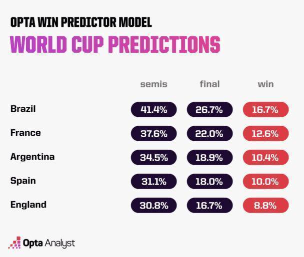 著名的阿兰·图灵研究所给出的预测,夺冠概率最高的也是巴西队,其概率为25%。其次是法国和阿根廷,概率分别是19%、13%。有机会夺冠的前几个球队还有英格兰、葡萄牙、西班牙等球队。